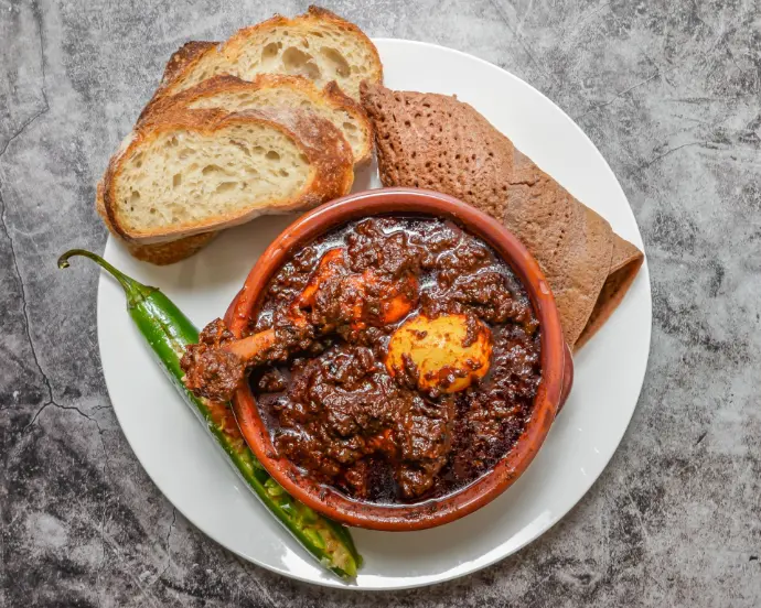 Ethiopia’s signature dish — slow-braised chicken in a spiced berbere sauce, finished with boiled egg and clarified butter. Deep, rich, and satisfying.
